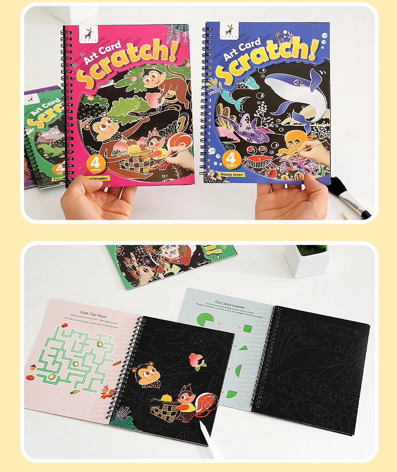 YUELU 4 Design Wholesale 15.7*20.7cm Cartoon Scratch Book Children DIY Educational Toys Magic Rainbow Scratch Art Paper For Kids